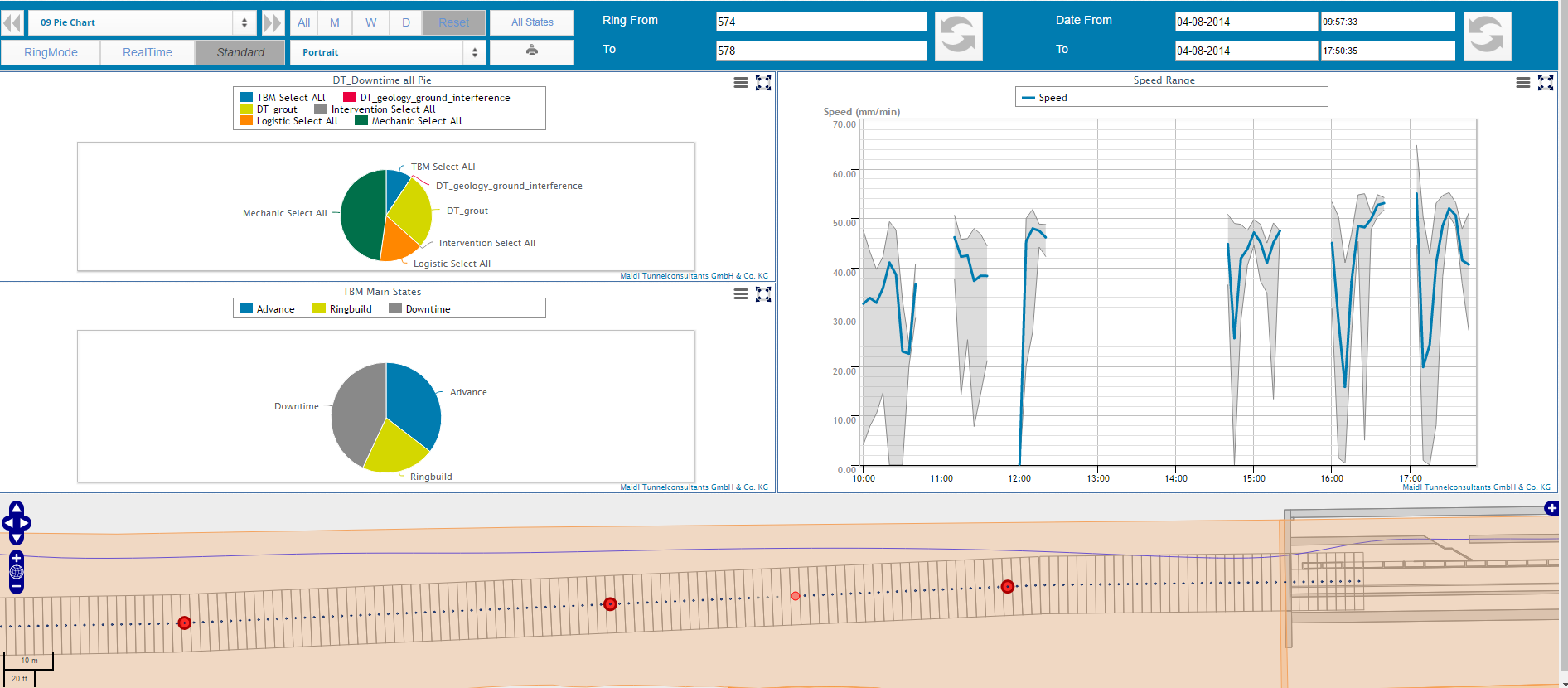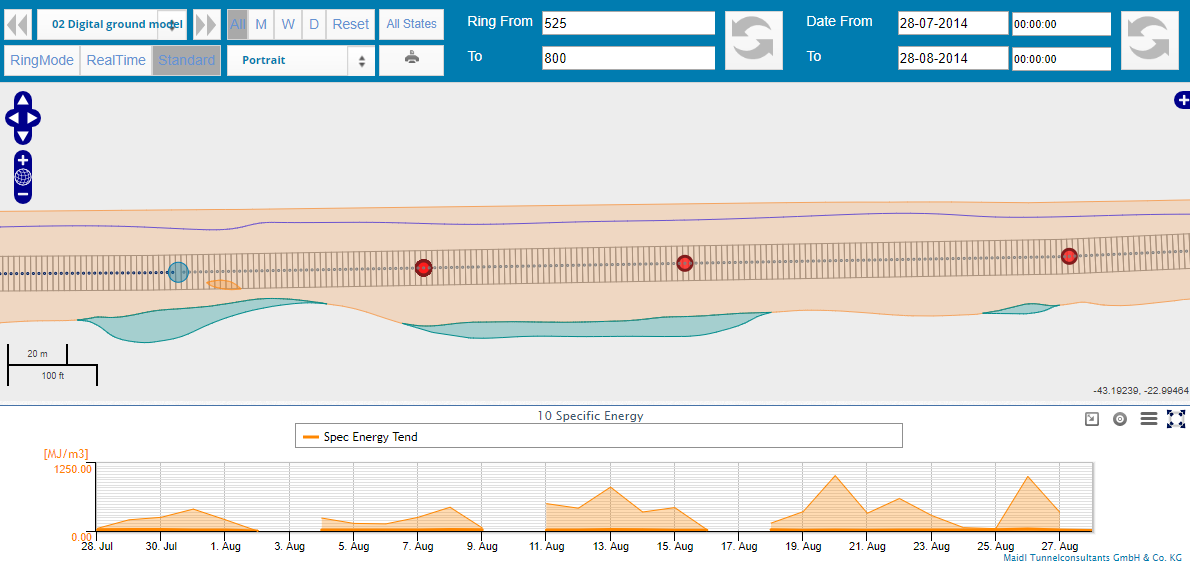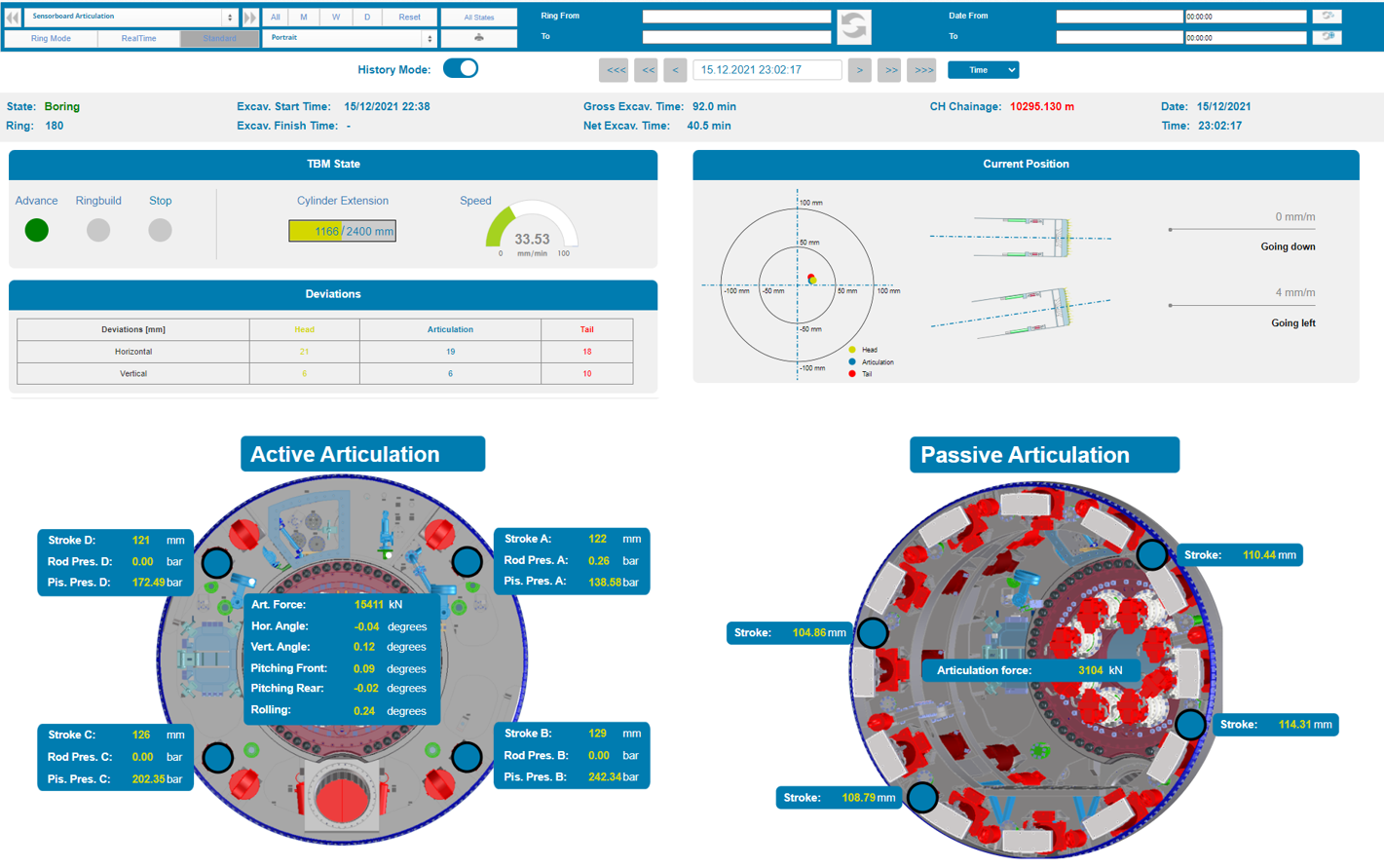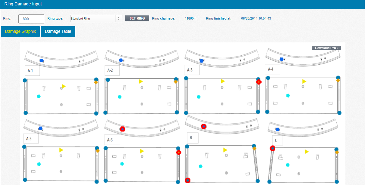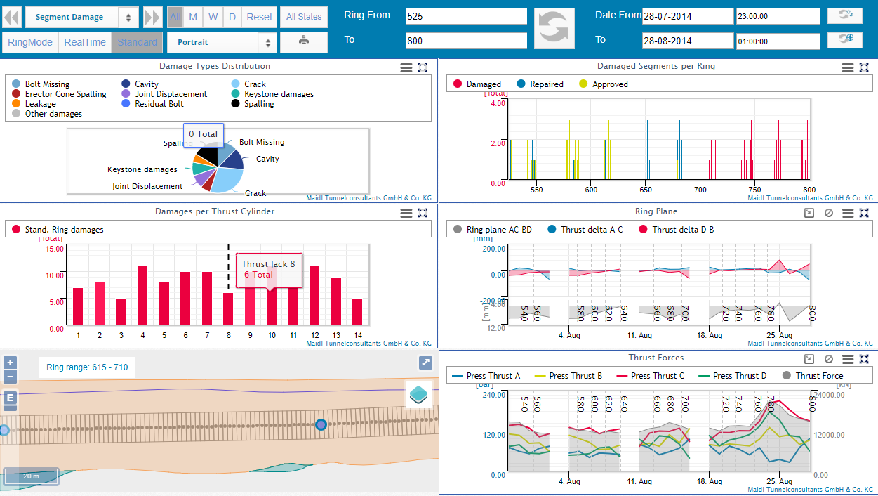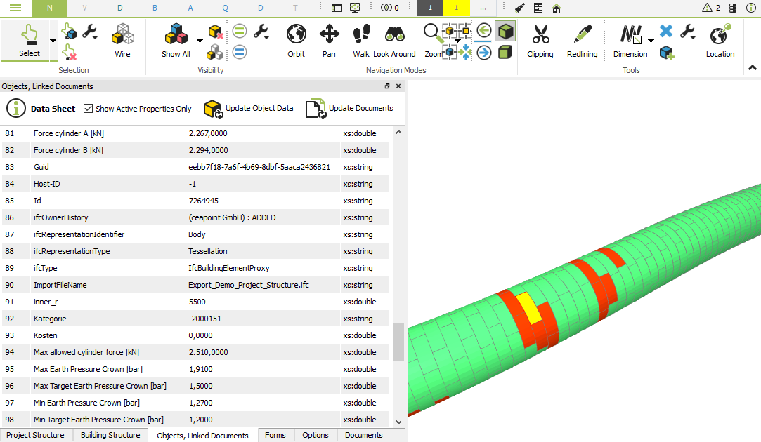 The tunnel model consists of the individual segmental linings representing the tunnel tubes. Each tunnel tube contains a number of rings consisting of a defined number of individual segments. Each digital segment has assigned various information from the start like its segment type or its ring number. During the tunnel advance, the information of the segments increases steadily by the incorporation of data from segment tracking and quality management, document linkage or highlighting of the TBM data history (e.g. thrust forces). An easily navigable visualization of the segmented lining allows a quick data identification, problem evaluation and overview of the projects progress.