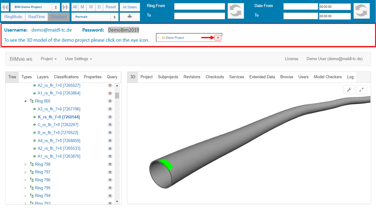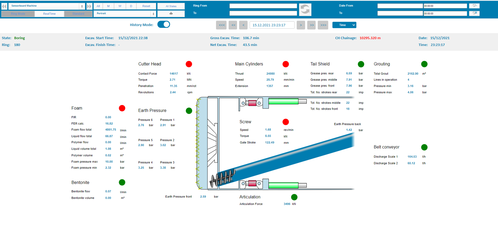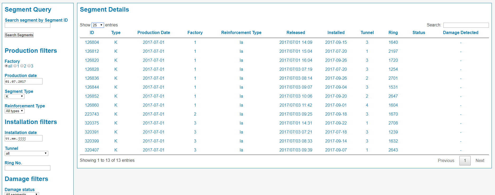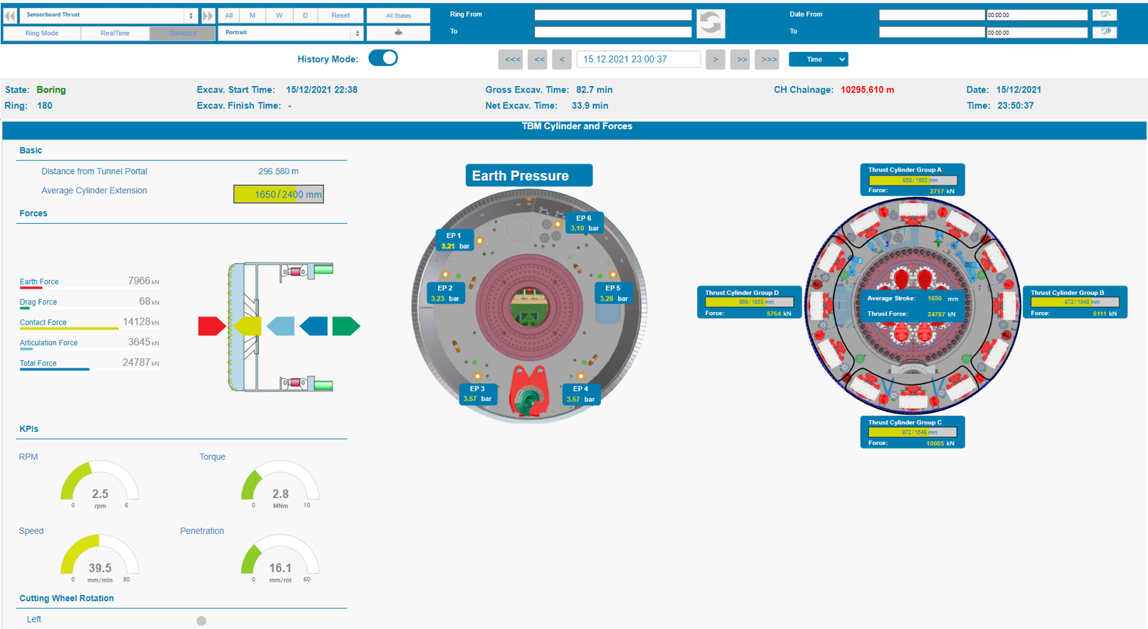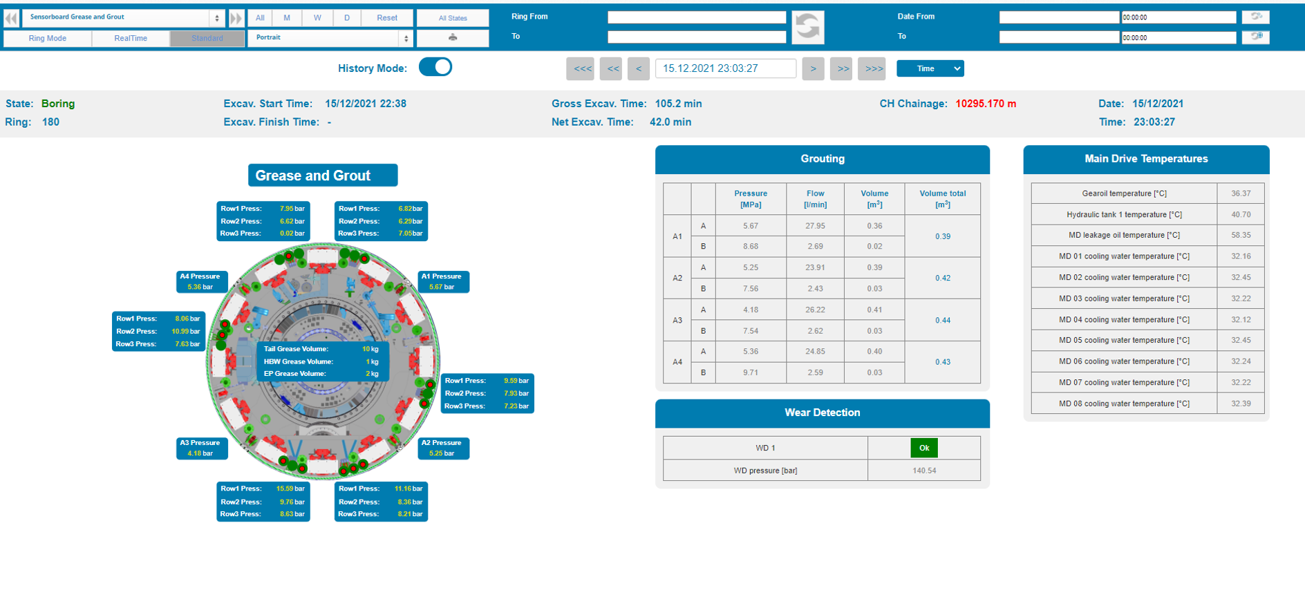 The tunnel model consists of the individual segmental linings representing the tunnel tubes. Each tunnel tube contains a number of rings consisting of a defined number of individual segments. Each digital segment has assigned various information from the start like its segment type or its ring number. During the tunnel advance, the information of the segments increases steadily by the incorporation of data from segment tracking and quality management, document linkage or highlighting of the TBM data history (e.g. thrust forces). An easily navigable visualization of the segmented lining allows a quick data identification, problem evaluation and overview of the projects progress.
