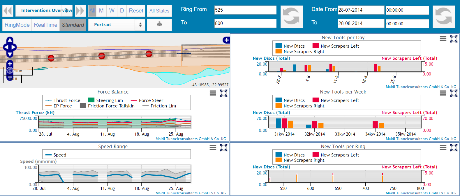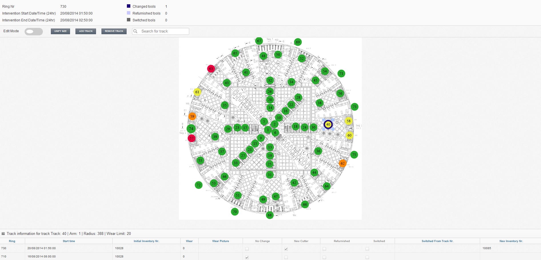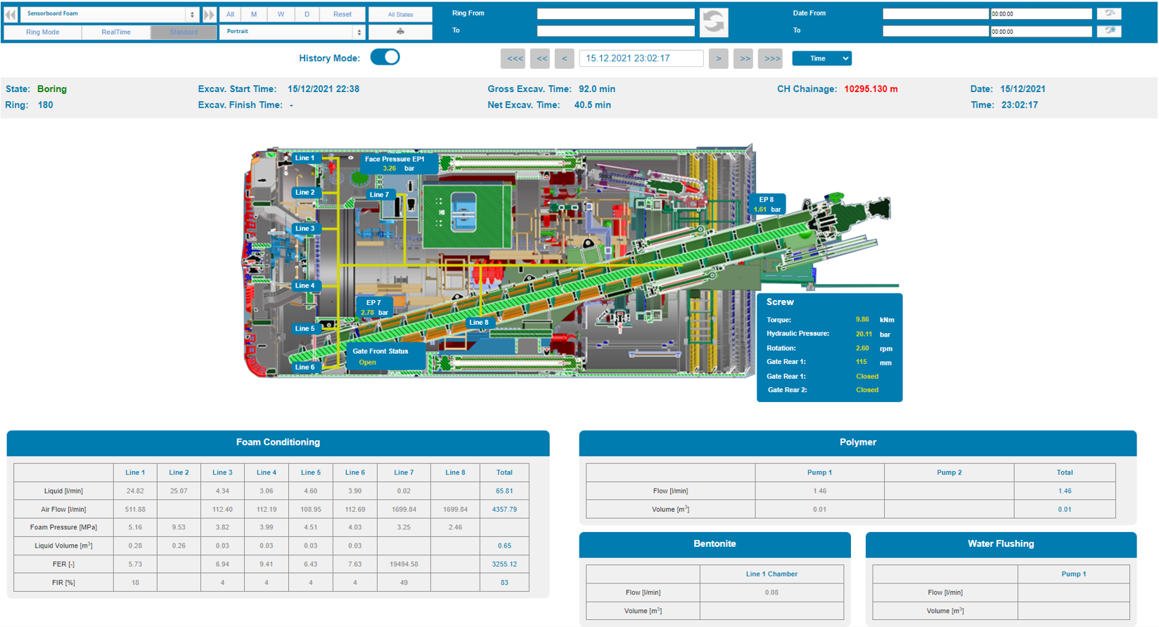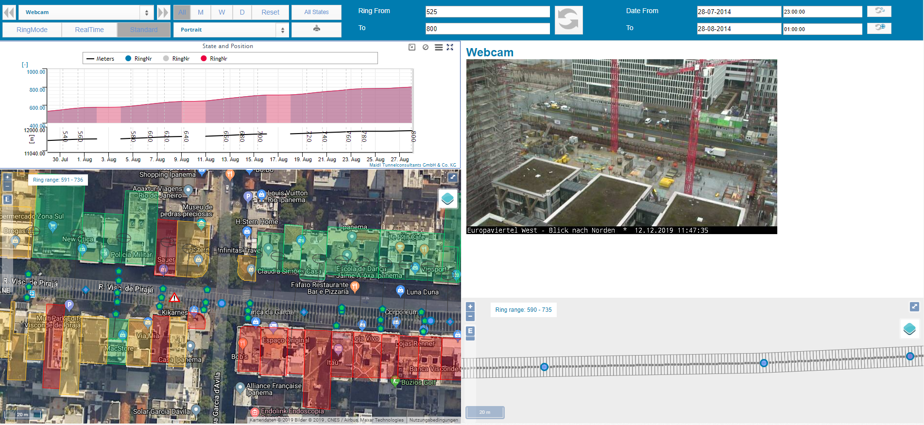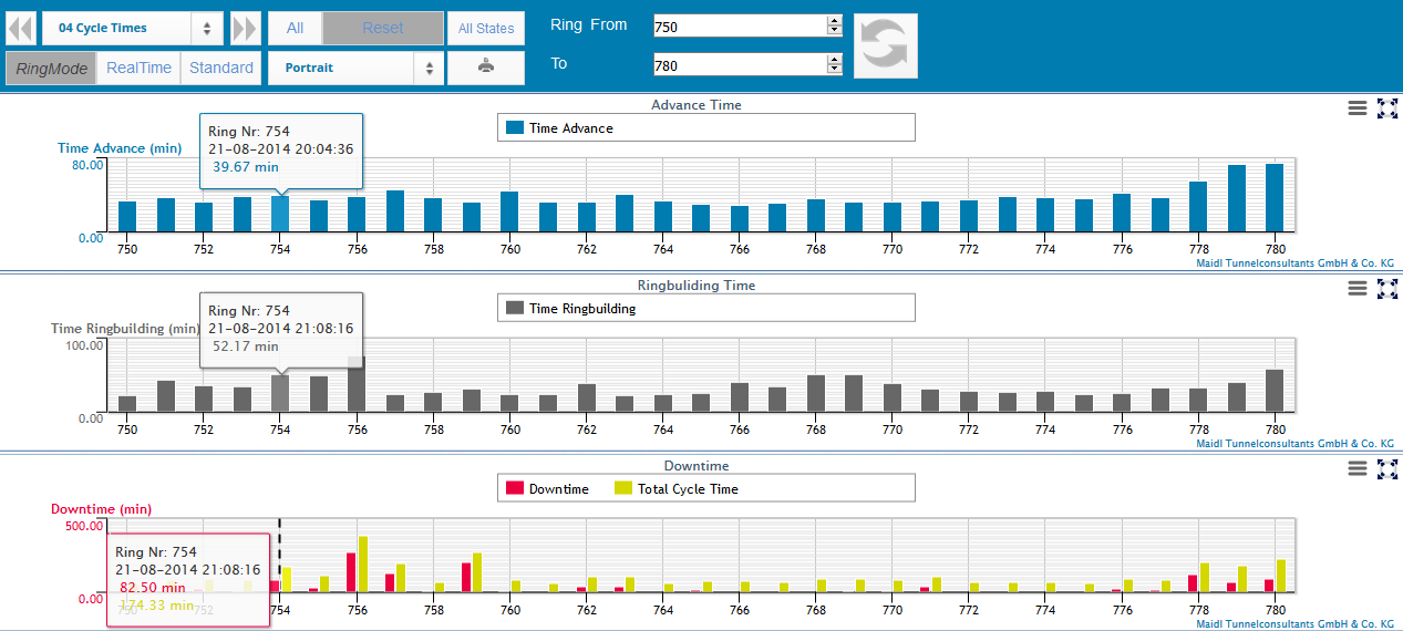 The tunnel model consists of the individual segmental linings representing the tunnel tubes. Each tunnel tube contains a number of rings consisting of a defined number of individual segments. Each digital segment has assigned various information from the start like its segment type or its ring number. During the tunnel advance, the information of the segments increases steadily by the incorporation of data from segment tracking and quality management, document linkage or highlighting of the TBM data history (e.g. thrust forces). An easily navigable visualization of the segmented lining allows a quick data identification, problem evaluation and overview of the projects progress.