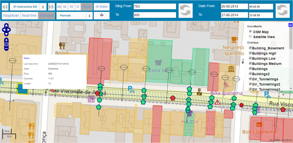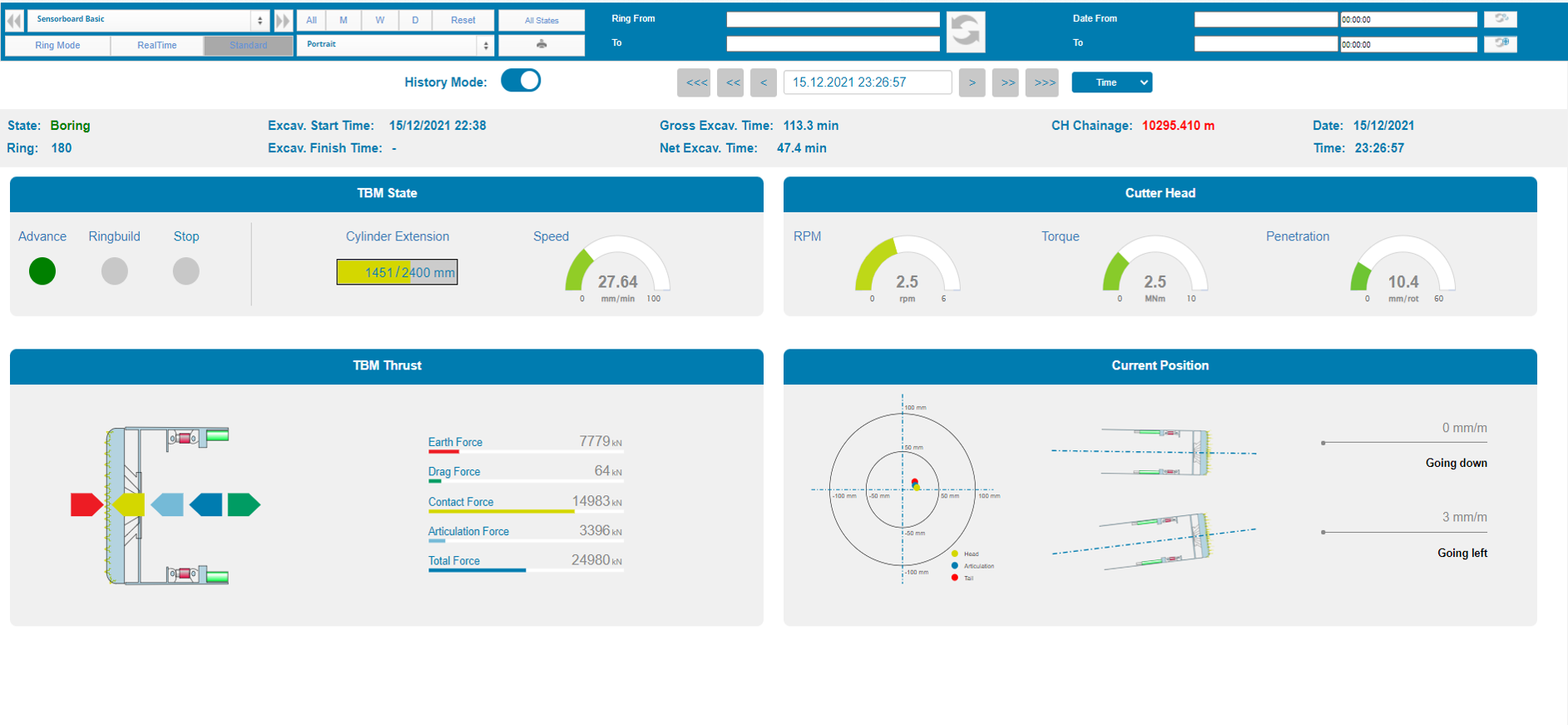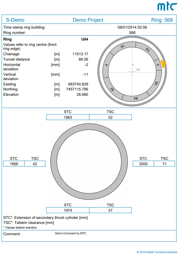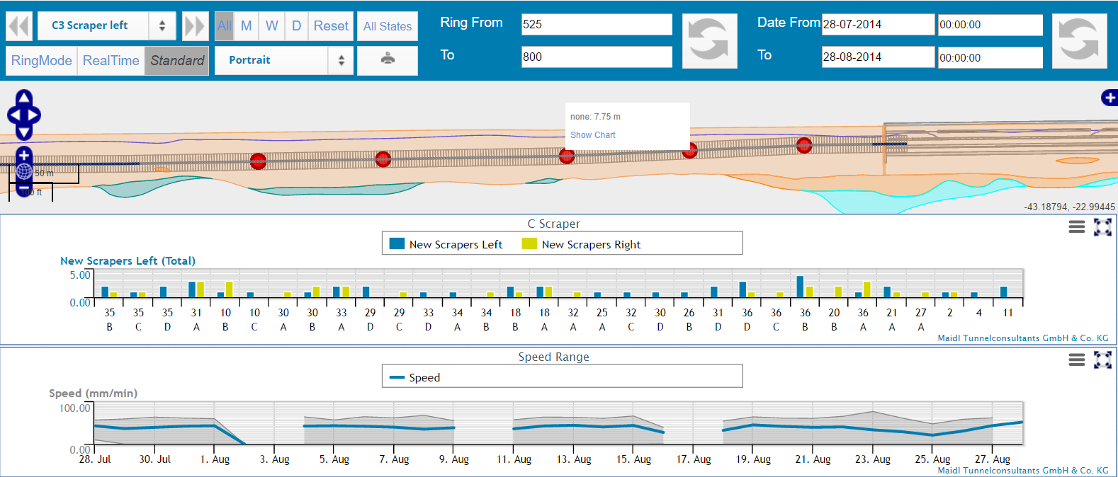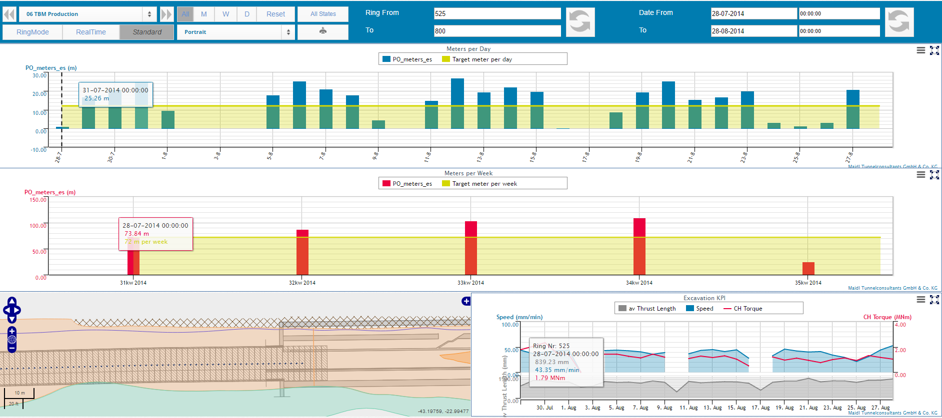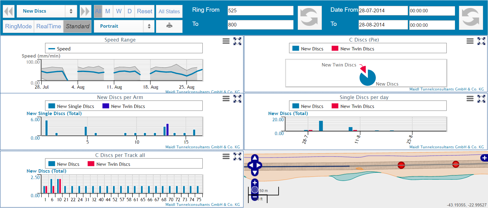 The tunnel model consists of the individual segmental linings representing the tunnel tubes. Each tunnel tube contains a number of rings consisting of a defined number of individual segments. Each digital segment has assigned various information from the start like its segment type or its ring number. During the tunnel advance, the information of the segments increases steadily by the incorporation of data from segment tracking and quality management, document linkage or highlighting of the TBM data history (e.g. thrust forces). An easily navigable visualization of the segmented lining allows a quick data identification, problem evaluation and overview of the projects progress.