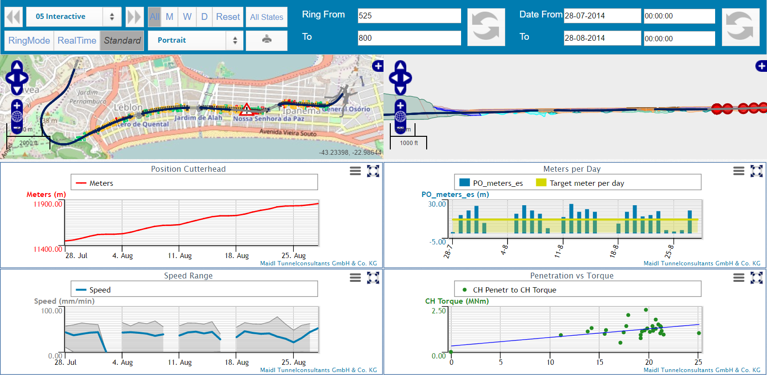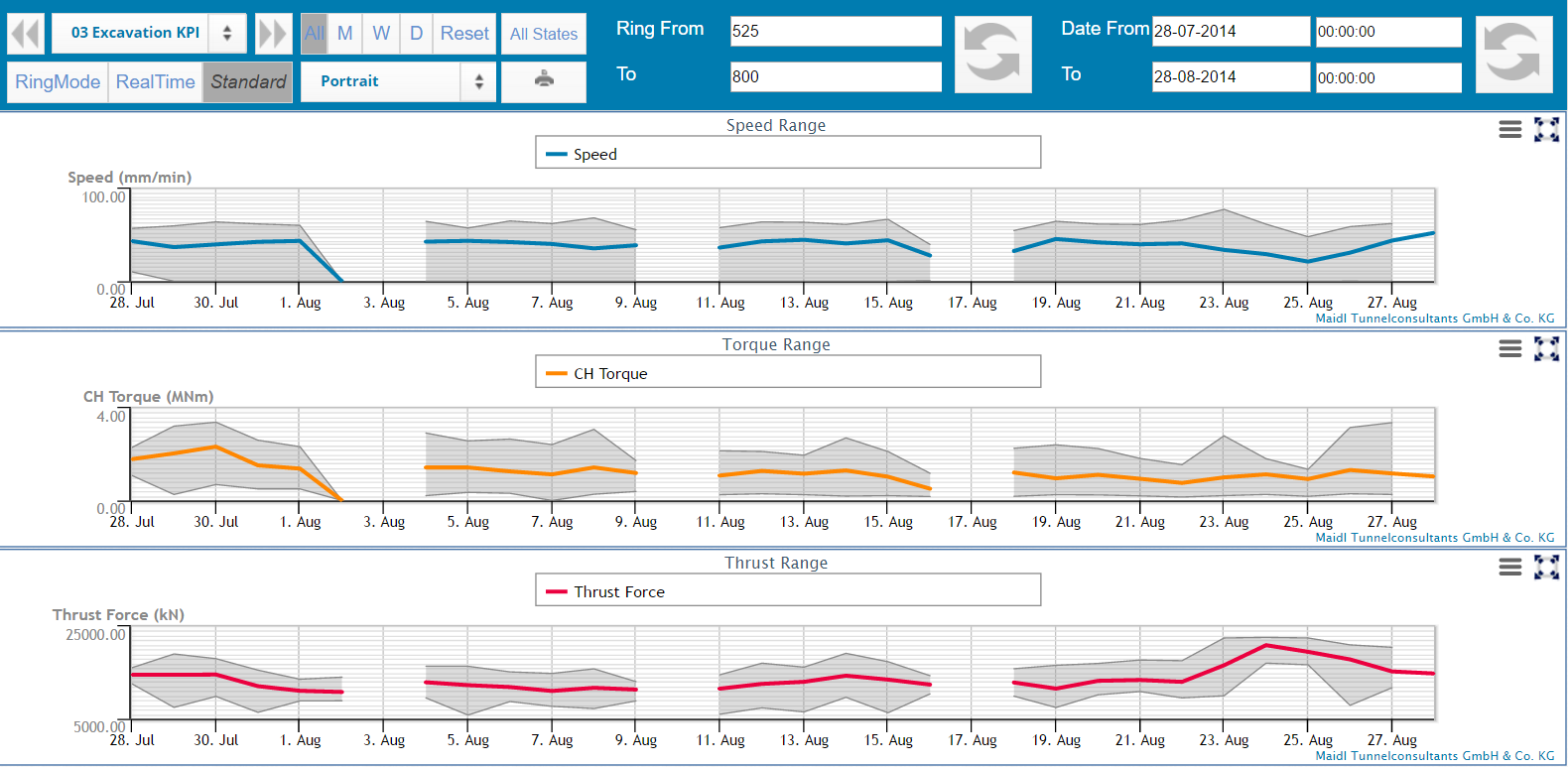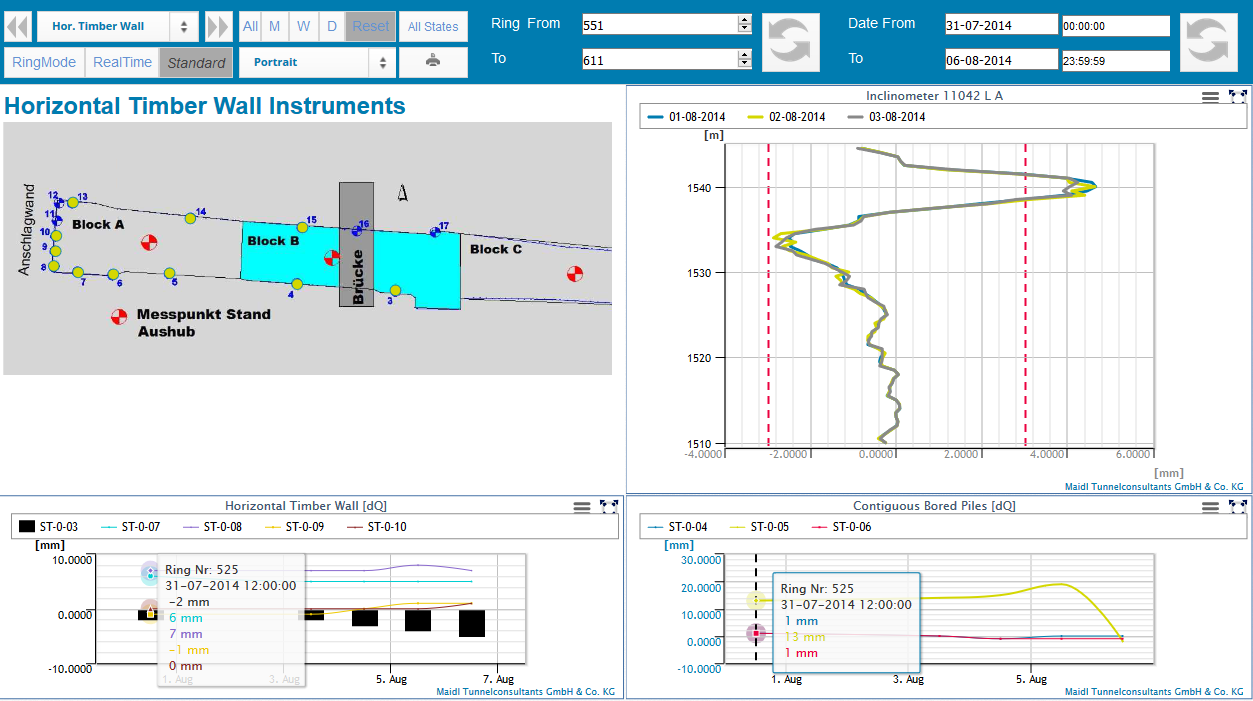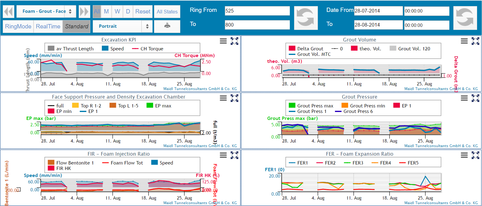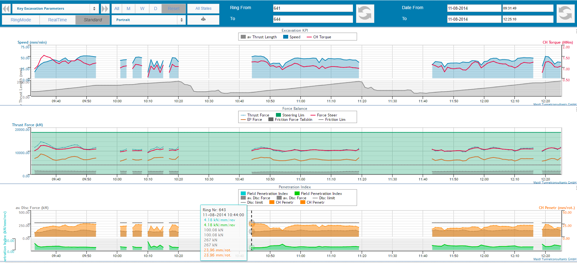The tunnel model consists of the individual segmental linings representing the tunnel tubes. Each tunnel tube contains a number of rings consisting of a defined number of individual segments. Each digital segment has assigned various information from the start like its segment type or its ring number. During the tunnel advance, the information of the segments increases steadily by the incorporation of data from segment tracking and quality management, document linkage or highlighting of the TBM data history (e.g. thrust forces). An easily navigable visualization of the segmented lining allows a quick data identification, problem evaluation and overview of the projects progress.