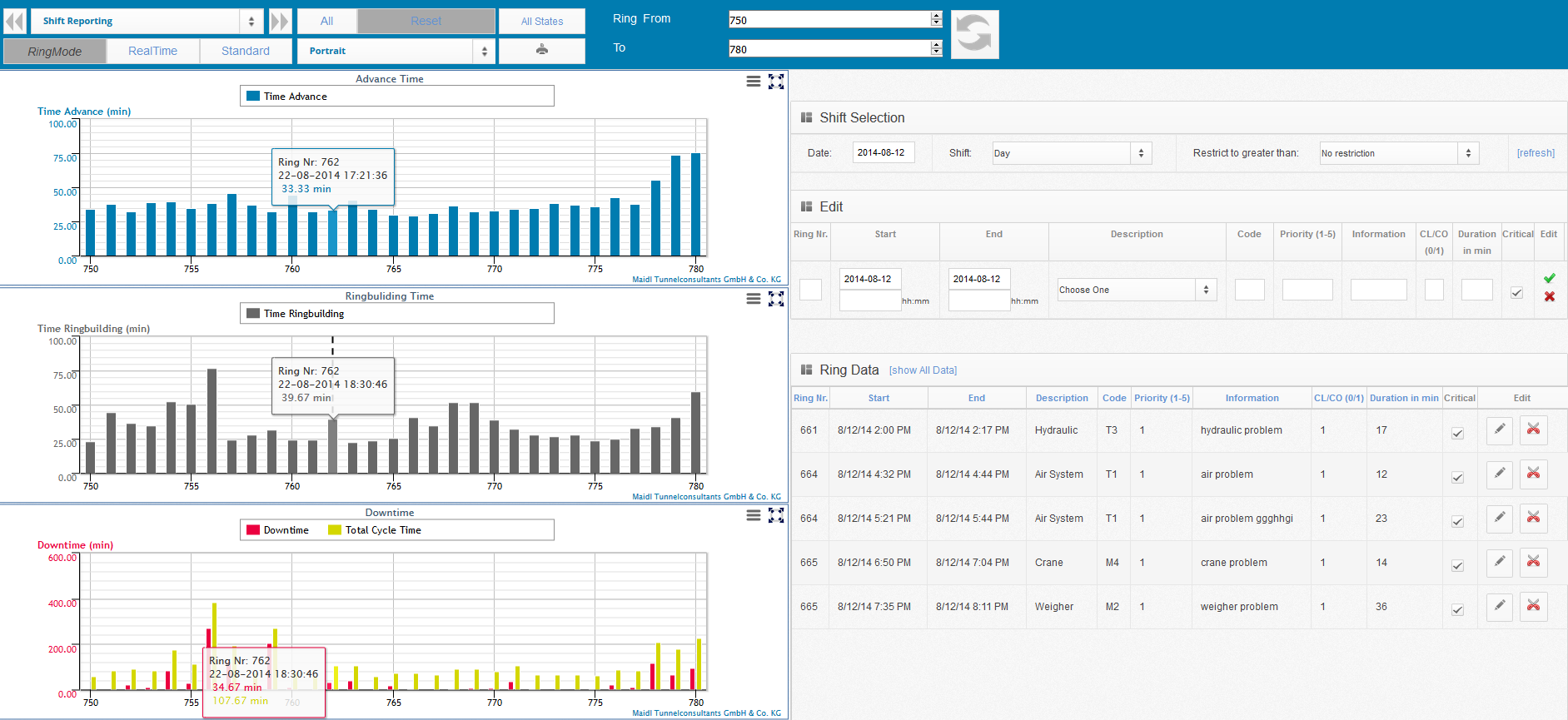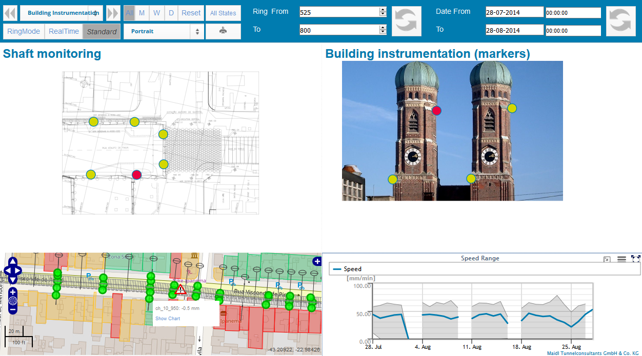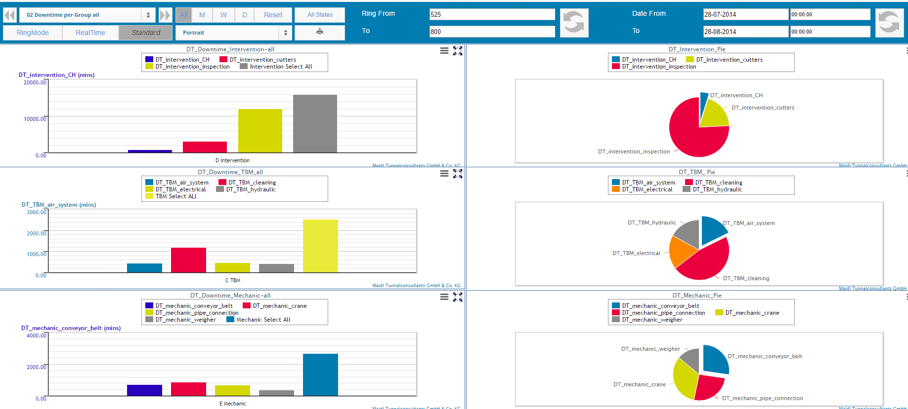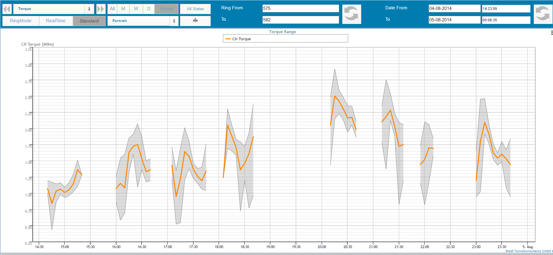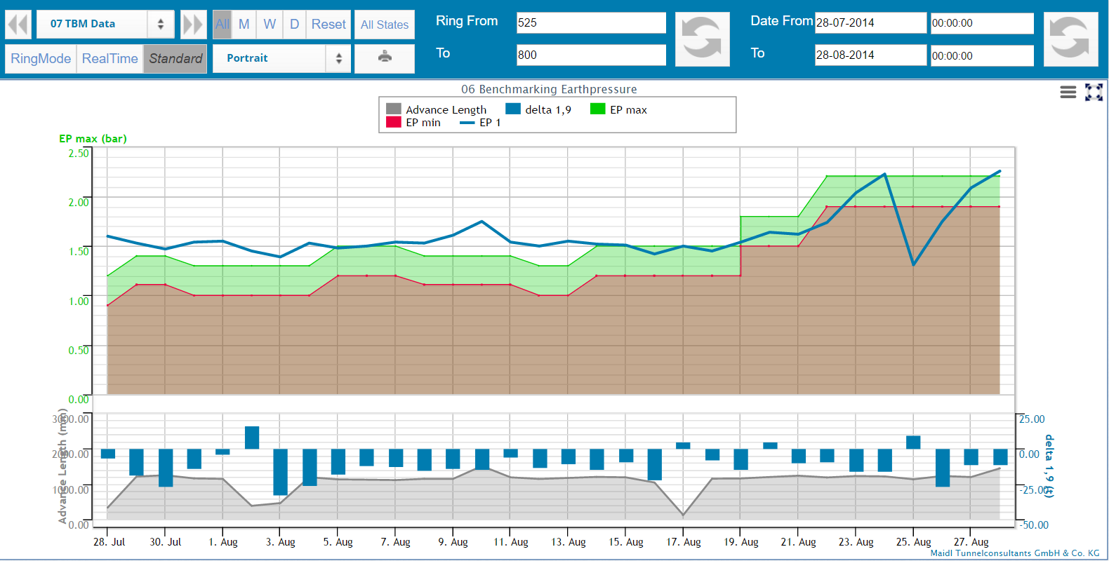 The tunnel model consists of the individual segmental linings representing the tunnel tubes. Each tunnel tube contains a number of rings consisting of a defined number of individual segments. Each digital segment has assigned various information from the start like its segment type or its ring number. During the tunnel advance, the information of the segments increases steadily by the incorporation of data from segment tracking and quality management, document linkage or highlighting of the TBM data history (e.g. thrust forces). An easily navigable visualization of the segmented lining allows a quick data identification, problem evaluation and overview of the projects progress.